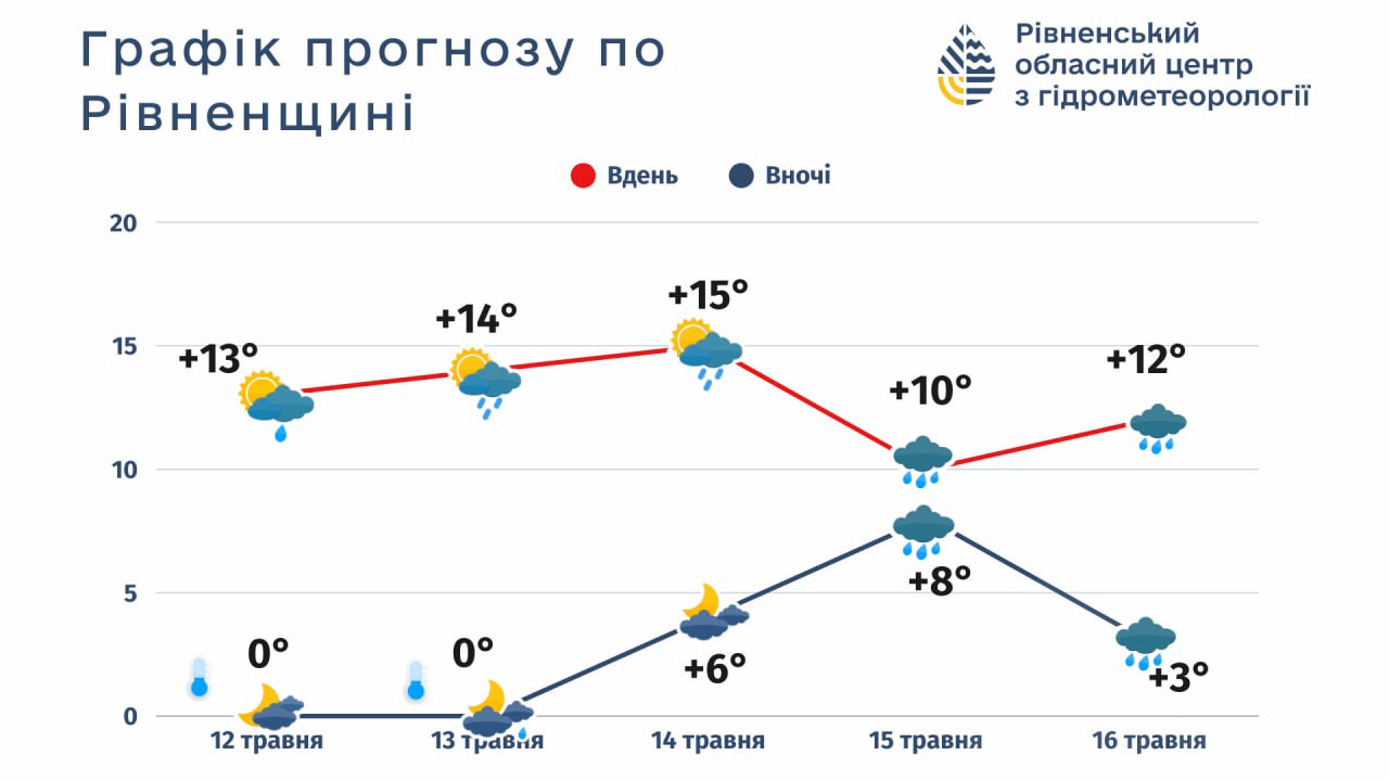 13 травня, вівторок: мінлива хмарність. Вночі без істотних опадів. Вдень короткочасний дощ. Вночі та вранці місцями слабкий туман. Вітер північно-західний, 7-12 м/с, вдень поривчастий. Температура вночі сильні заморозки 0-3º, вдень 10-15º тепла. Атмосферний тиск суттєво не зміниться.