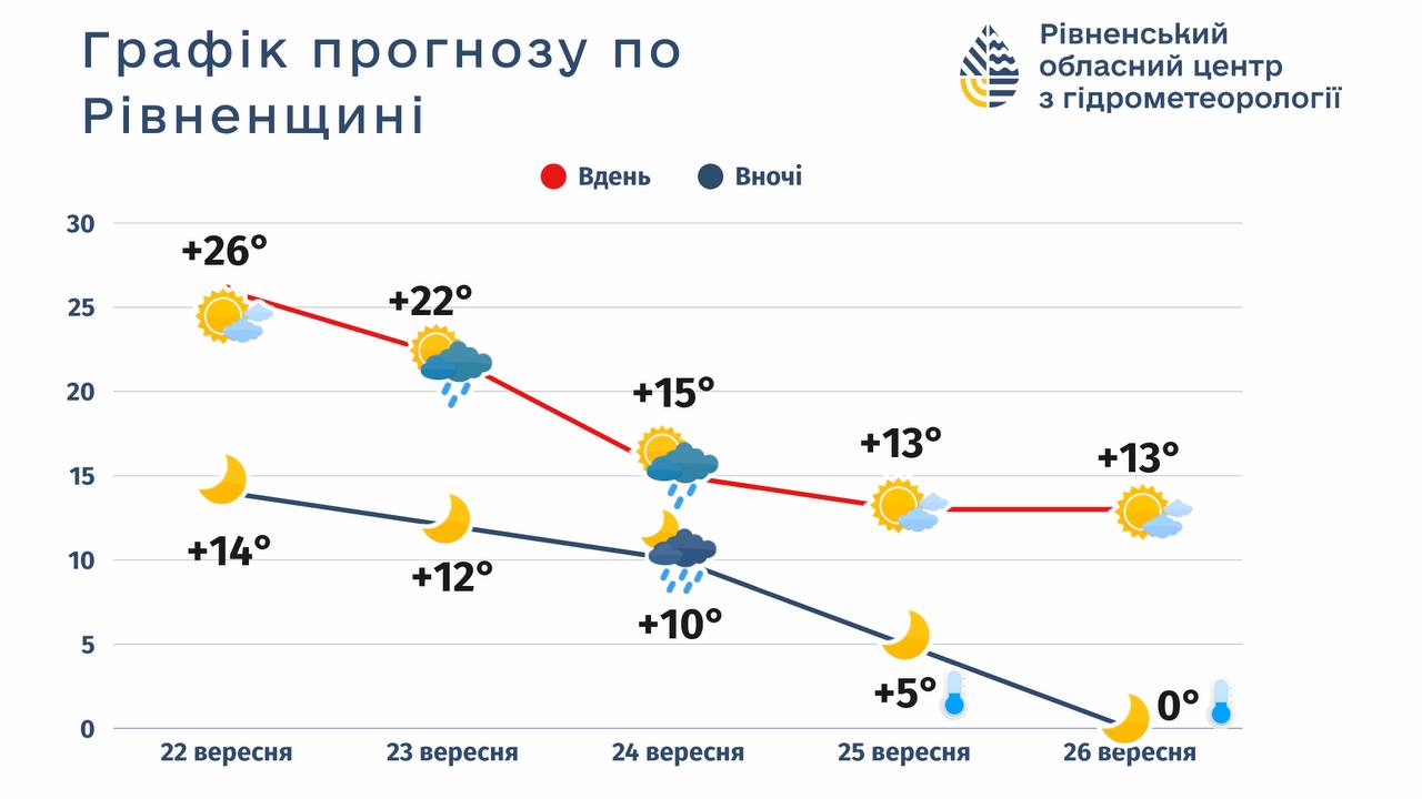 – Вдень 23 вересня та протягом доби 24 вересня холодний атмосферний фронт зумовить невеликі та помірні дощі, поступове зниження температури повітря. В зв’язку із вторгненням холодного арктичного повітря з півночі Європи вночі та вранці 25 вересня очікуються заморозки на поверхні грунту 0-5º, а вночі та вранці 26 вересня очікуються заморозки в повітрі 0-3º, – попереджають в обласному центрі з гідрометеорології.