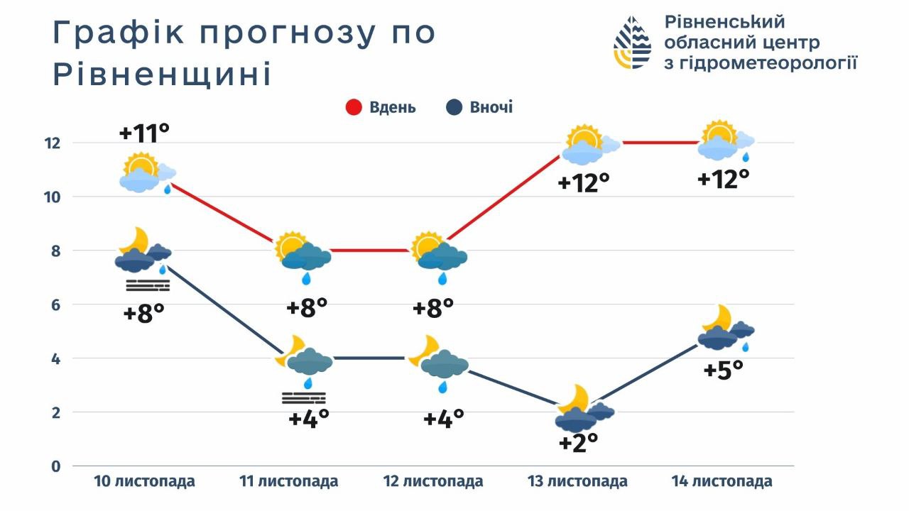11 листопада,вівторок:  хмарно. Місцями невеликий дощ. Вночі та вранці туман. Вітер північно-західний , 5-10 м/c. Температура вночі 1-6º тепла, вдень 5-10° тепла. Атмосферний тиск буде слабо рости .