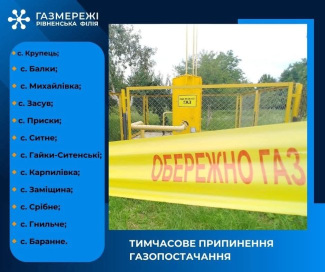 У зв’язку з цим буде тимчасово припинено газопостачання до осель 1374 споживачів природного газу в таких населених пунктах: Крупець; Балки; Михайлівка; Засув; Приски; Ситне; Гайки-Ситенські; Карпилівка; Заміщина; Срібне; Гнильче та Баранне.