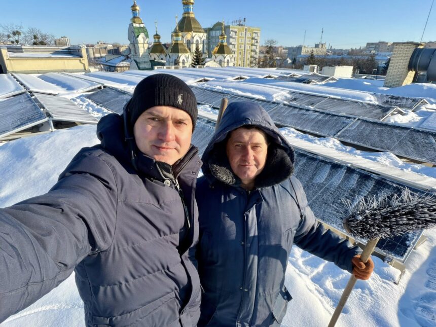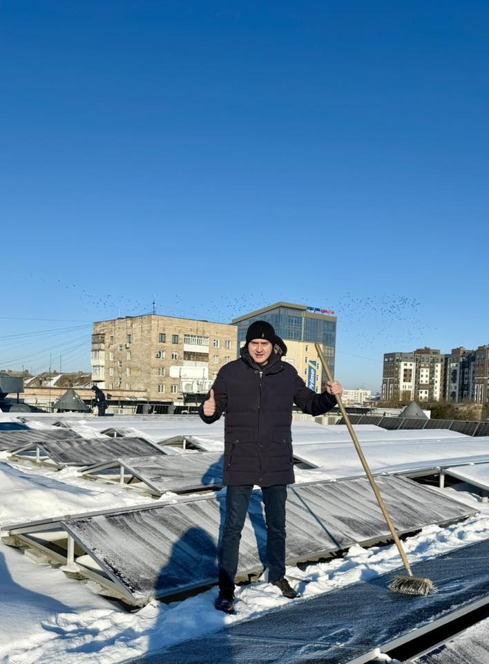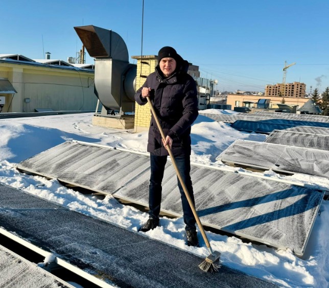 Директор ТЦ Олександр Оверчук показав у Facebook те, як очищає сонячні панелі від снігу: