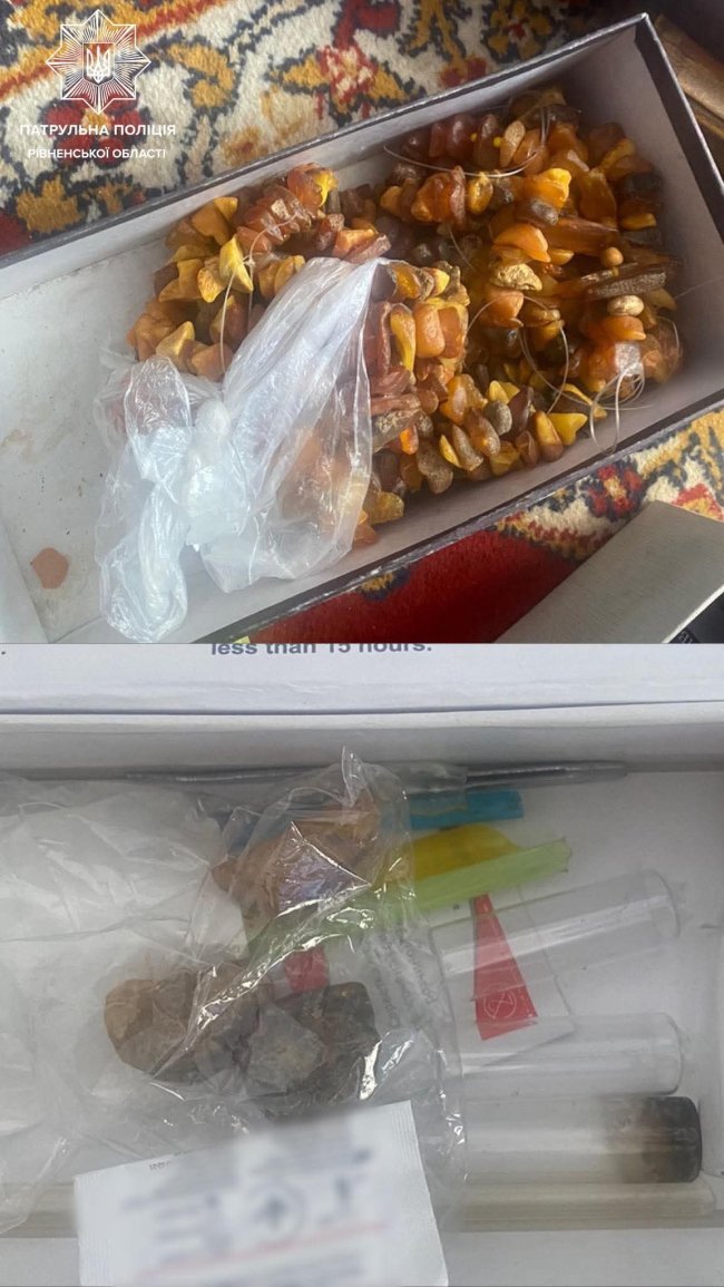 Патрульні повідомили, що є звернення про те, що громадянин зберігає незареєстровану зброю, та попросили дозволу оглянути гараж. Там поліцейські виявили пластикове відро з камінням, схожим на бурштин.