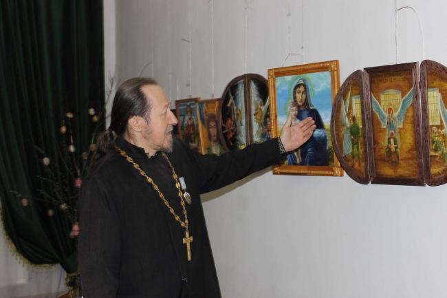 Однією з головних робіт виставки є авторська ікона отця Олександра, на якій зображені захисники української землі.