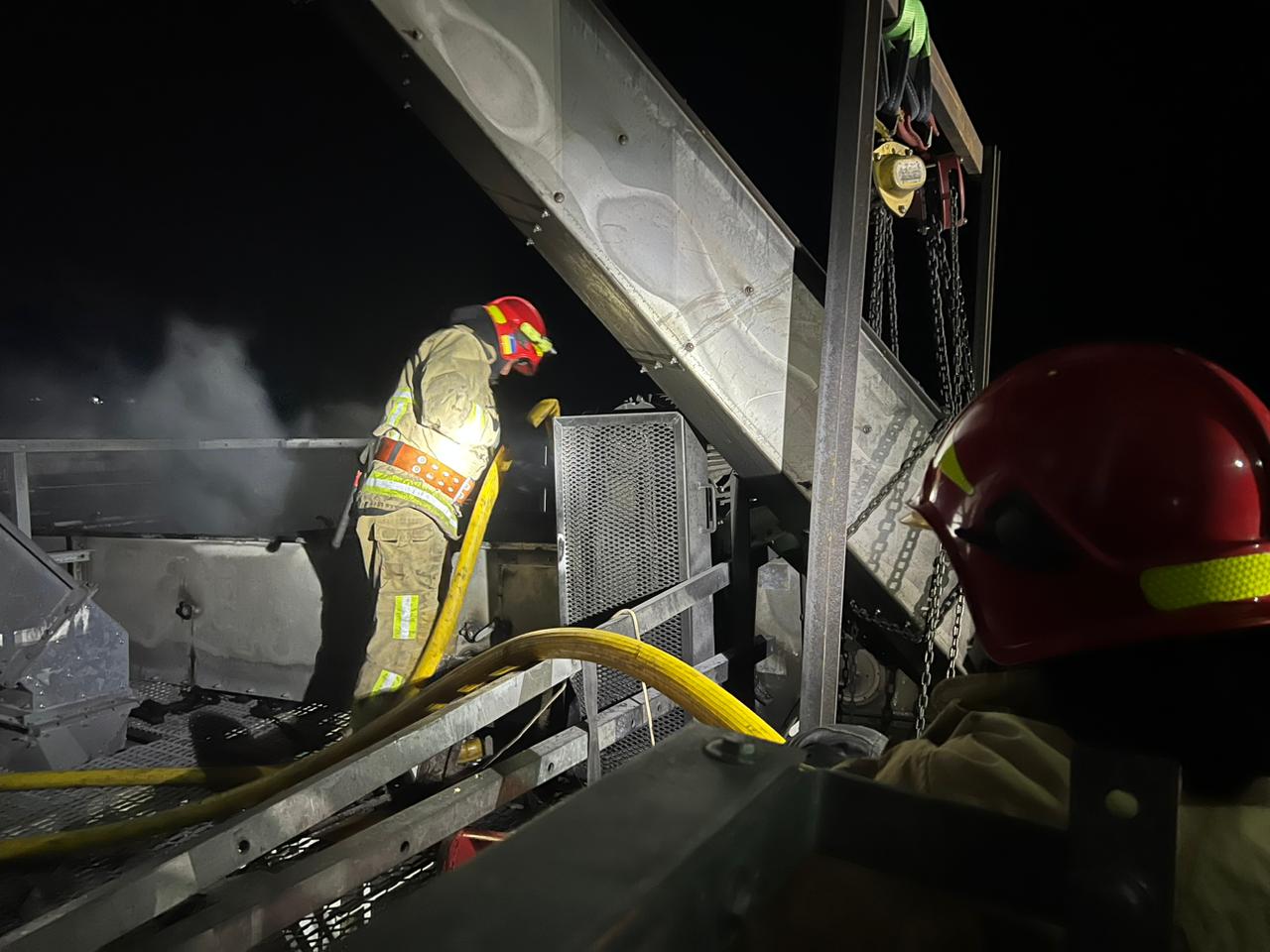 Рятувальники побачили, що вогнем охоплено транспортну стрічку зовнішнього елеватора. Пожежу швидко загасили. Вогнем було пошкоджено 2 м. кв. стрічки. Жертв та постраждалих немає. Причина пожежі та збитки ще встановлюються. До гасіння пожежі було залучено дві автоцистерни, пожежну автодрабину та десять рятувальників.