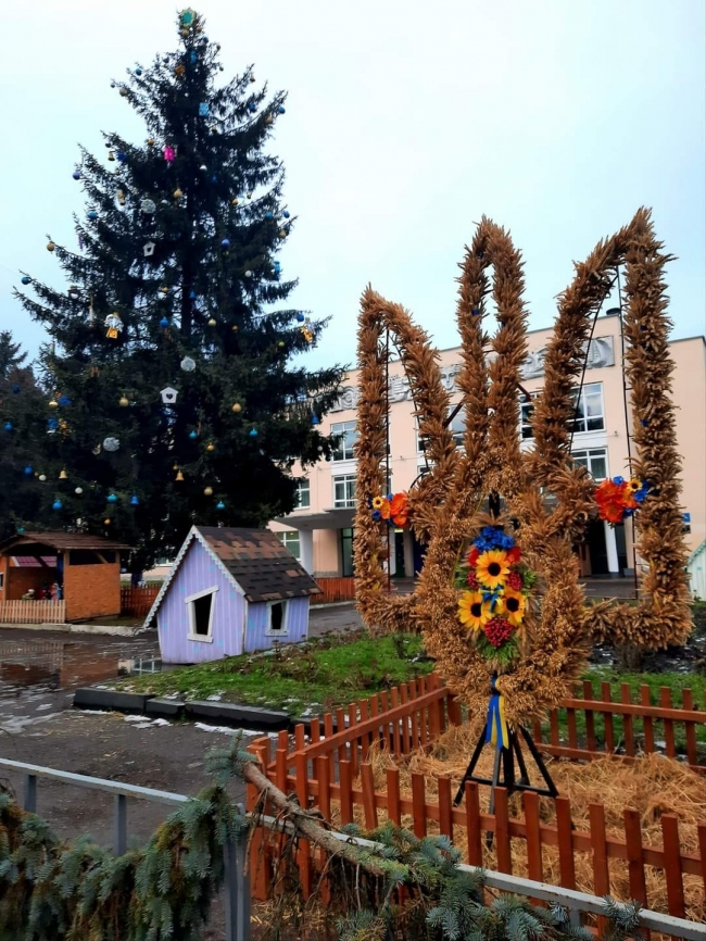 Оригінальний дідух прикрашає територію біля святкової ялинки.