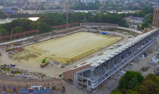 На західній трибуні стадіону йде облаштування монолітних плит перекриття над підтрибунними приміщеннями. Також там триває підготовка до закладення фундаменту під плити центральної частини трибуни.