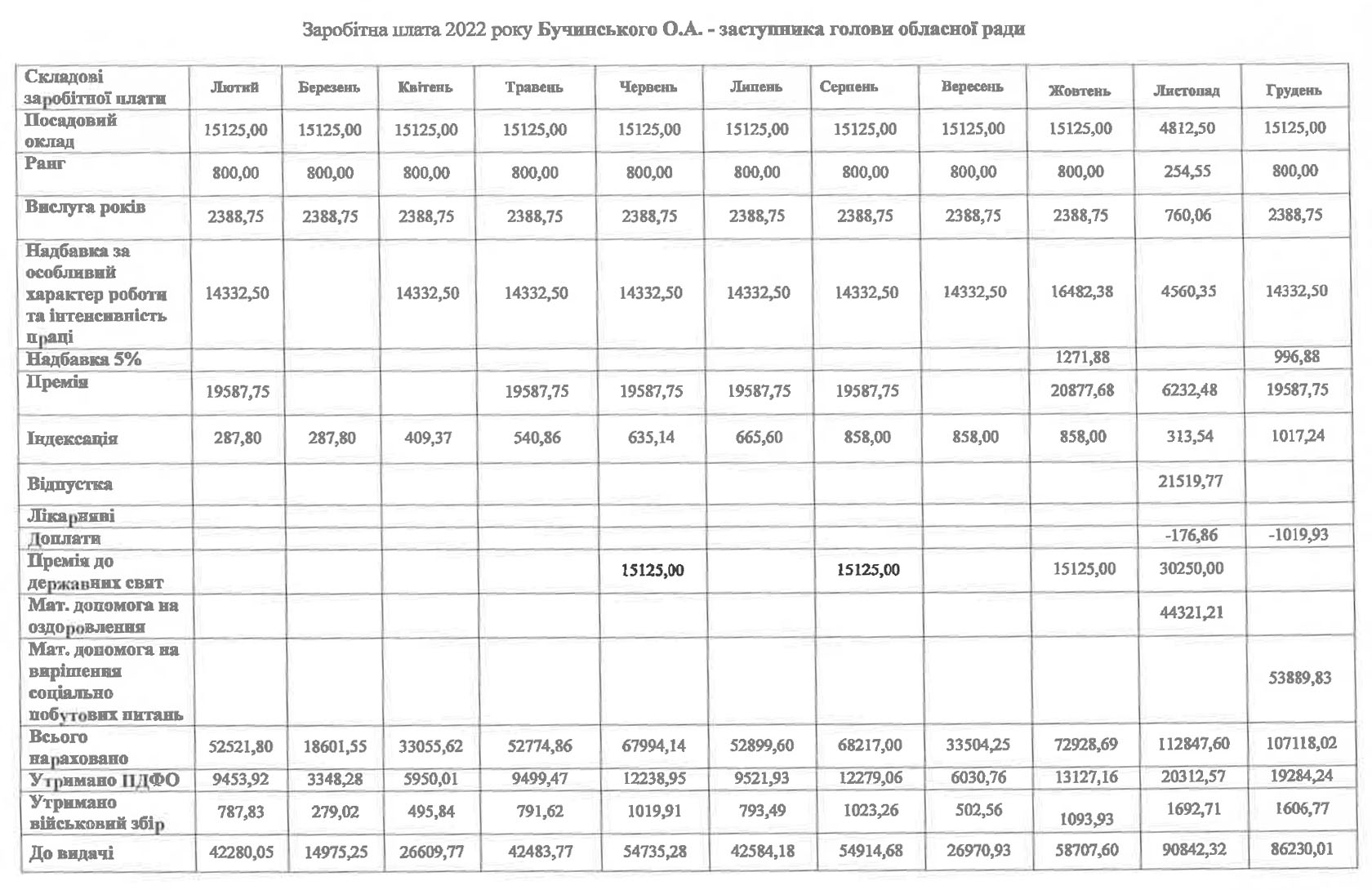 Заступник голови Олексій Бучинський: надбавка 95%; премія 130%-138%; премії до державних свят – 100% у жовтні та 200% у листопаді; матеріальна допомога на оздоровлення та вирішення соціально побутових питань – 98211,04 гривень.