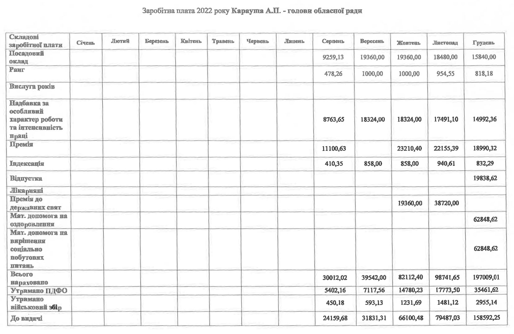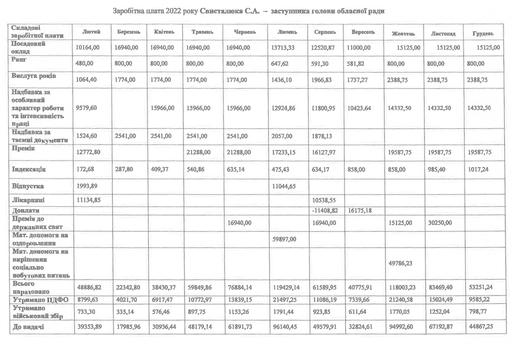 Заступник голови Сергій Свисталюк: надбавка 94-95%; премія 125 — 130%; премії до державних свят – 100% у жовтні та 200% у листопаді; матеріальна допомога на оздоровлення та вирішення соціально побутових питань – 49786,23 гривень.