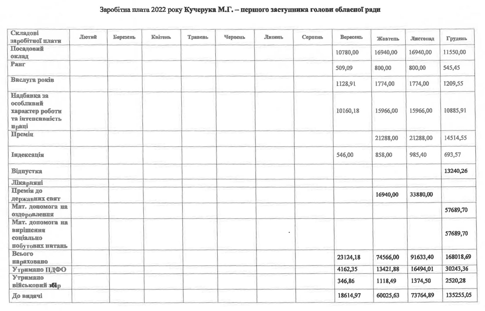 Перший заступник Микола Кучерук: надбавка 94%; премія 125%; премії до державних свят – 100% у жовтні та 200% у листопаді; матеріальна допомога на оздоровлення та вирішення соціально побутових питань – 115379,4 гривень.