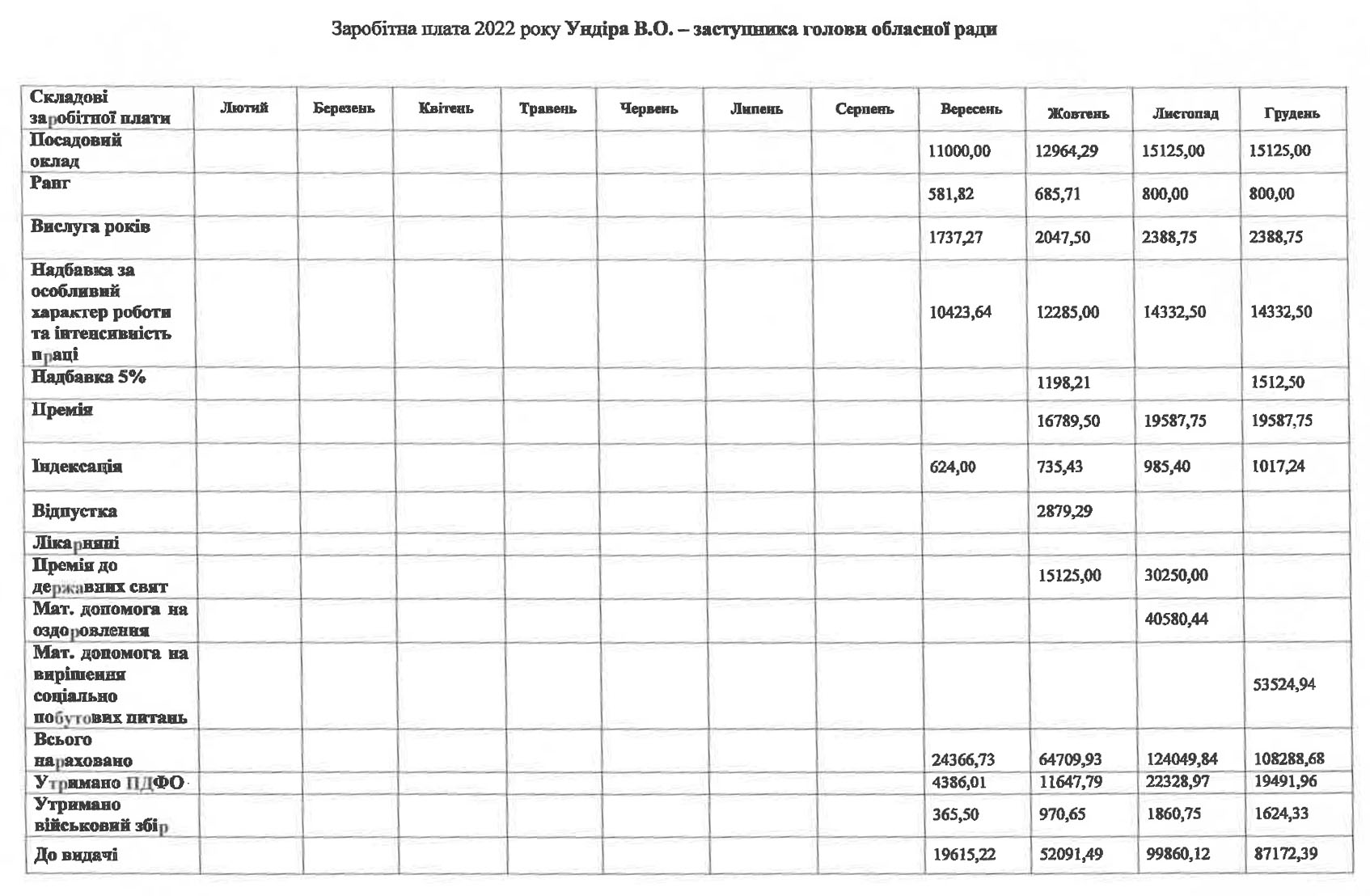 Заступник голови Віталій Ундір: надбавка 95%; премія 130%; премії до державних свят – 100% у жовтні та 200% у листопаді; матеріальна допомога на оздоровлення та вирішення соціально побутових питань – 94105,38 гривень.