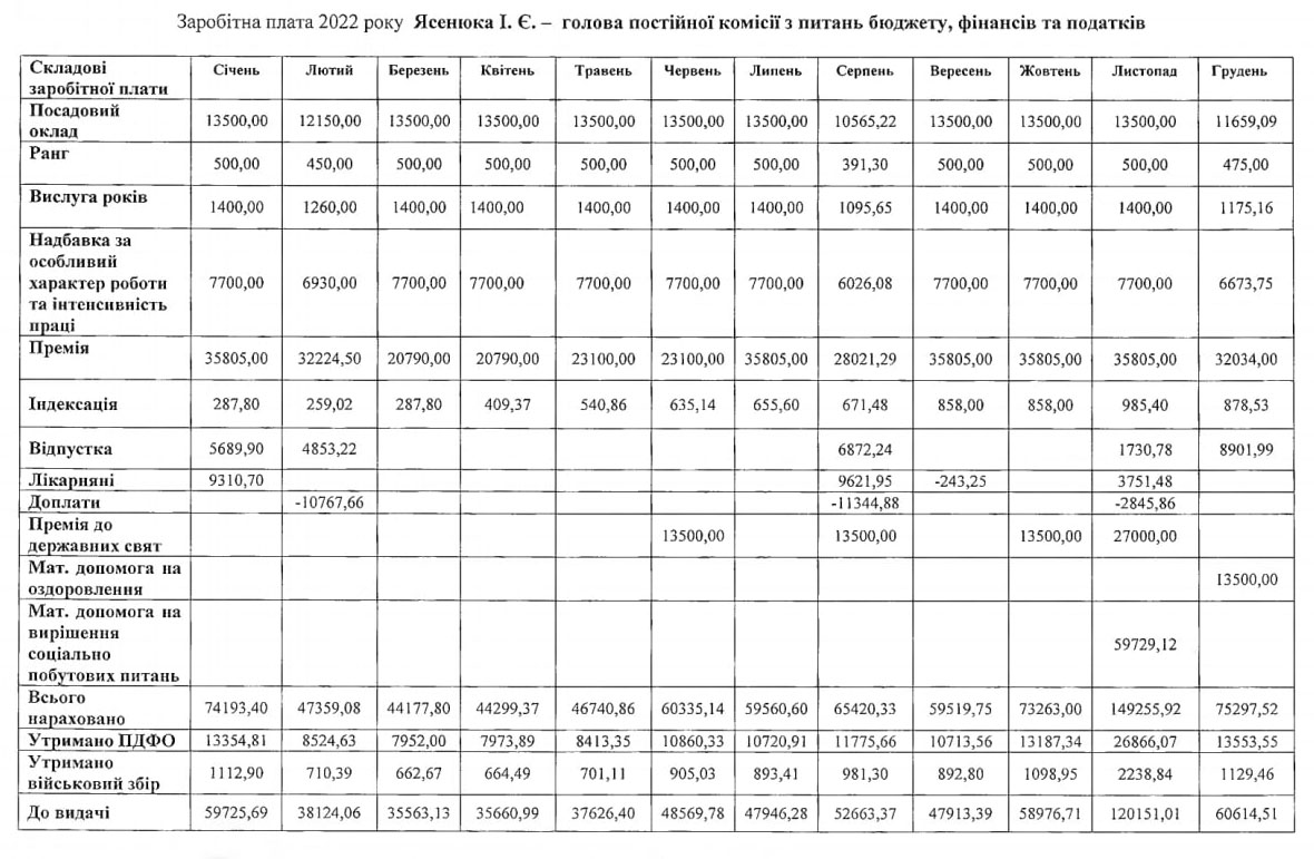 Зауважимо, що голова обласної ради за вересень дійсно не отримував премії, а лише надбавку до посадового окладу. Однак премію 265% посадового окладу та надбавку 50% отримував голова постійної комісії з питань бюджету, фінансів та податків Ігор Ясенюк. А також премії до державних свят – 100% у жовтні та 200% у листопаді та 73229,12 гривень. матеріальної допомоги на оздоровлення та вирішення соціально побутових питань.