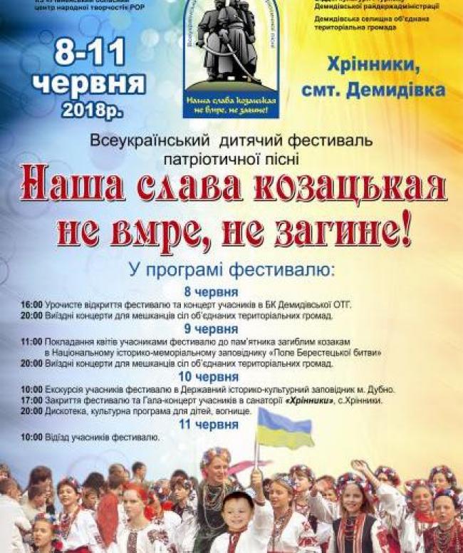 Цьогоріч дитячий фестиваль патріотичної пісні, який декілька років поспіль проводився як регіональний, отримав статус Всеукраїнського. Окрім учасників з Рівненщини, очікують юних патріотів з Волинської, Луганської, Хмельницької та Тернопільської областей, а також міста Київ. Від нашої області виступатимуть колективи з Дубенського, Зарічненського, Костопільського, Рівненського районів, міст Вараш та Рівне.