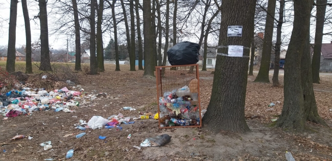 Місце для відходів обрали поблизу оголошення про заборону викидати сміття.