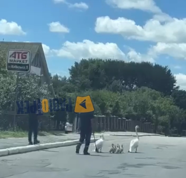 У Корці зупинили рух, щоб дорогу перейшла сімейка лебедів (ВІДЕО)