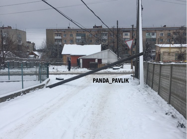 Зі світлин видно, що опора висить на дротах та перекриває проїзд. У коментарях місцеві мешканці зазначали, що вона так лежить цілий день.