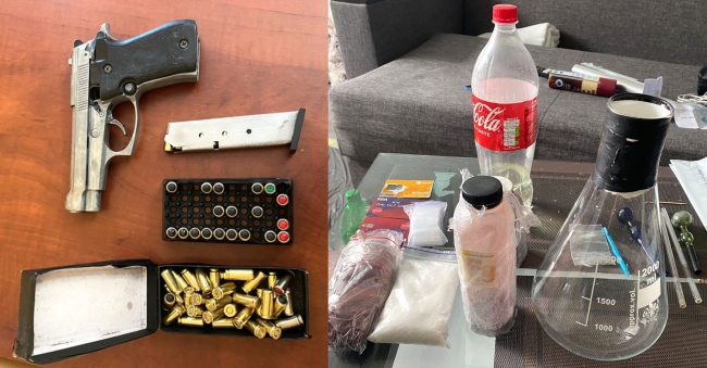Під час слідчих дій поліцейські виявили й вилучили пістолет без будь-яких маркувань, 57 набоїв, пристрої для вживання наркотичних засобів, поліетиленовий пакет із білою порошкоподібною речовиною, подрібнену марихуану та майже 20 кілограмів «сонячного» каміння.
