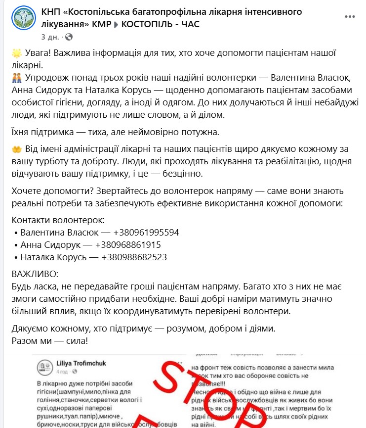 Але вони ніяк не заперечили про те, що у лікарні дійсно є потреба та її покривають волонтери.