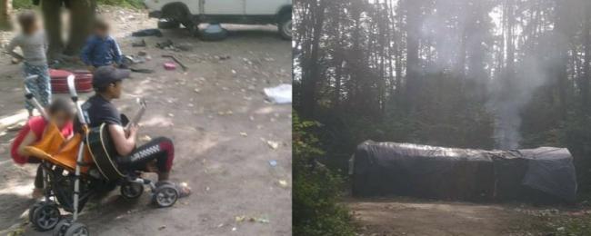 Табір налічує 30 людей, які живуть в наметах. Всього – три сім’ї по восьмеро дітей в кожній. Кажуть, що приїхали із Закарпаття, де в них згоріла хата. В лісопосадці живуть вже 5 місяців.
