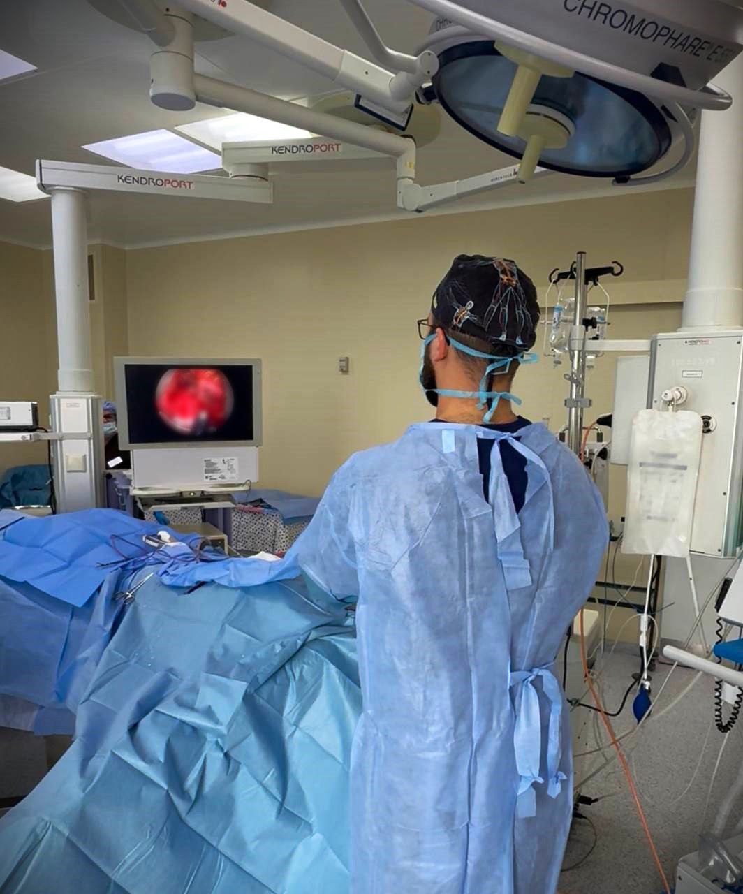 – На цих фото – лікар хірург-онколог Олександр Боярський, він на новому обладнанні виконує відеомедіастиноскопію та біопсію лімфовузлів середостіння. Раніше визначити тип пухлини не могли іншими методами. Тепер пацієнти з підозрами на пухлини легень чи лімфатичних вузлів можуть проходити найсучаснішу діагностику прямо в обласному протипухлинному центрі, – пояснив Карауш.