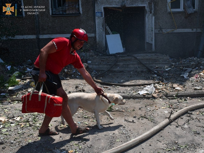 У Миколаєві, у знищеному росіянами будинку, в одній із квартир на четвертому поверсі лишився лабрадор. Про це рятувальникам повідомив власник собаки, його раніше змогли евакуювати за допомогою автодрабини.