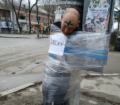 Мародера вже за традицією прив’язали до стовпа та намалювали на лобі хрест.