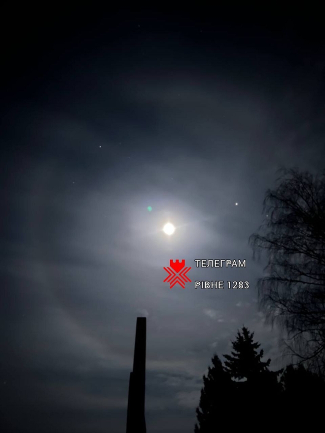 – В Рівному можна спостерігати місячне гало. Згідно з народними прикметами, місячне гало є передвісником нестабільної погоди, особливо взимку, – йдеться у дописі на місцевому телеграм-каналі Рівне1283.