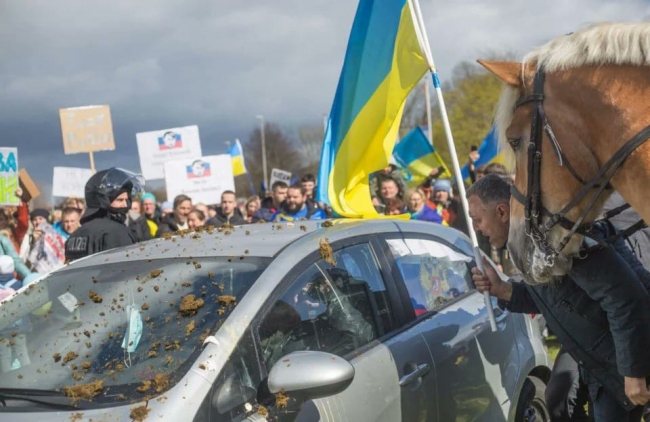 Далеко не поїхали – колону перестріли ті, хто підтримує Україну. Рашистів просто закидали конячими екскрементами. Про це розповів у соцмережі польський журналіст Вітольд Шабловський.