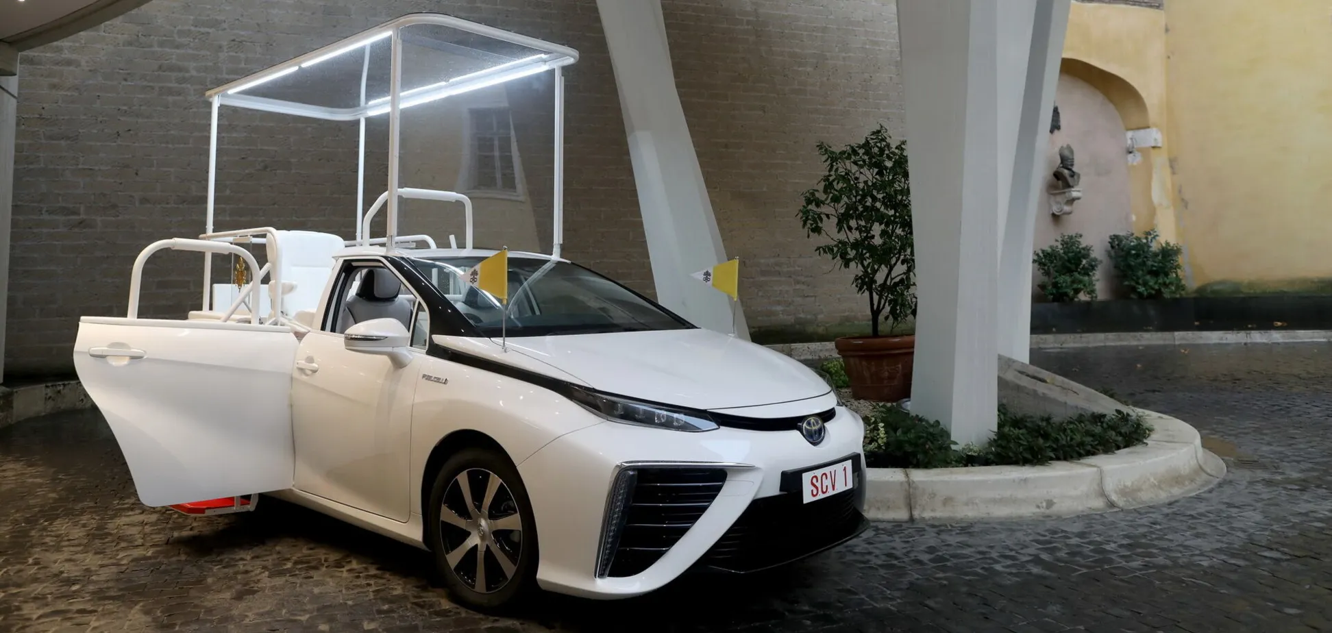 Toyota Mirai Popemobile створений на базі нинішнього покоління водневого седана Mirai і здатний без дозаправки долати до 500 км.