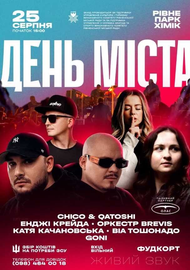 Музичний гурт “ТоШоНаДо”, українська співачка “Катя Качановська”, альт-поп гурт (співачка) “Енджі Крейда”, рок-оркестр “BREVIS”, реп та хіп-хоп виконавці “Chico&Qatoshi” з відомими хітами “Допоможе ЗСУ”, “Ластівки”. Їх усіх можна буде почути завітавши у парк “Хімік”. Вхід вільний.