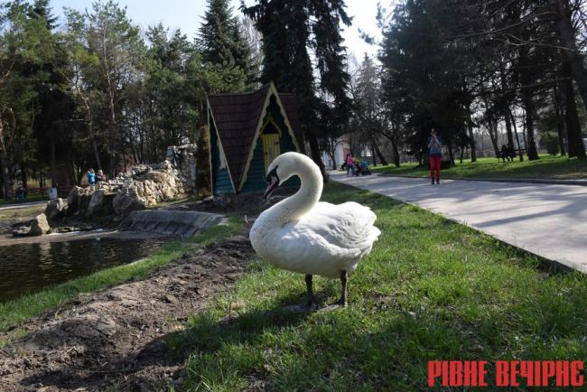 Сьогодні у парку Молоді у Рівному на озері знову плавають лебеді. Ще зранку працівники тресту зеленого господарства привезли та зібрали для них будиночок, тепер фахівці зоопарку повернули птахів на воду після зимівлі.