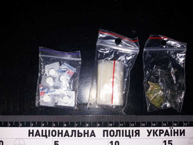 Під час поверхневої перевірки у наплічнику 28-річної місцевої жительки поліцейські виявили наркотичні речовини, розфасовані у сліп-пакети. Із місця події вилучили п’ять поліетиленових пакетів з кристалоподібною речовиною білого кольору, вісім пластикових блістерів з нарковмісними таблетками та один — з речовиною рослинного походження зеленого кольору.