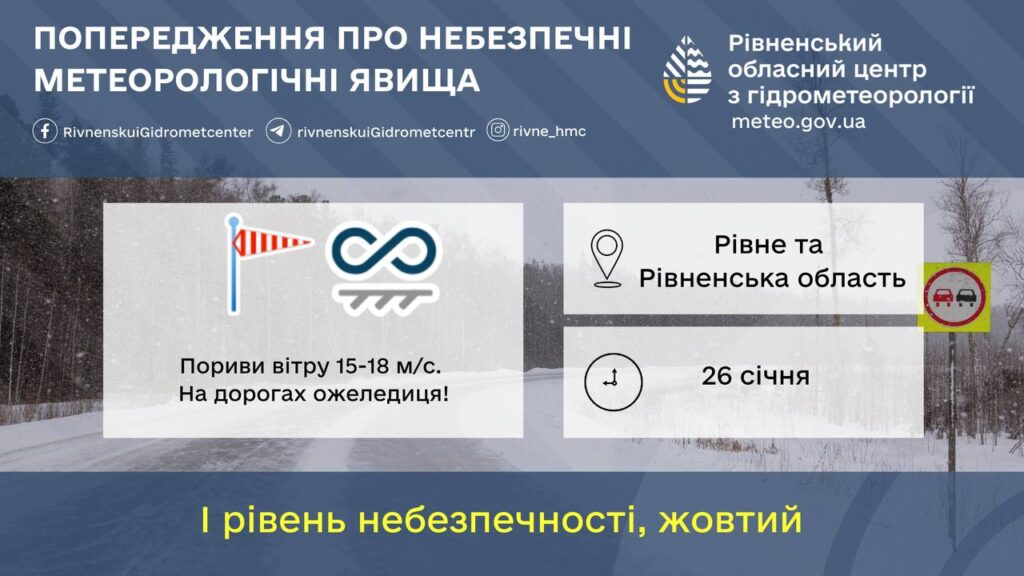 – Хмарно. Вночі місцями невеликий сніг та мокрий сніг. Вдень місцями невеликий мокрий сніг з дощем. Місцями слабка ожеледь, слабке налипання мокрого снігу. Вночі та вранці слабкий туман. На дорогах ожеледиця. Вітер південний, 7-12 м/с, пориви 15-18 м/с! – попереджають в обласному центрі з гідрометеорології.