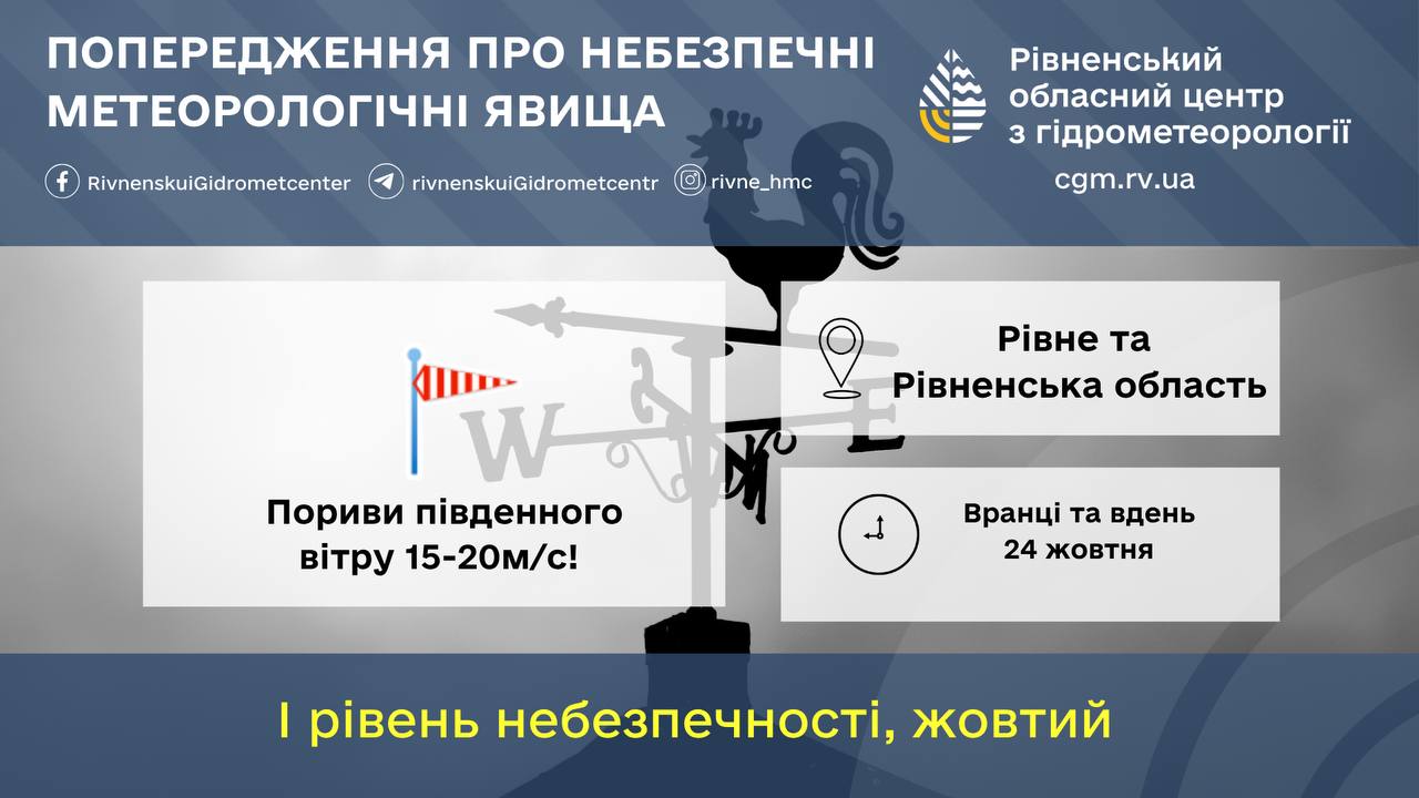 – Хмарно з проясненнями. Вночі без істотних опадів. Вдень короткочасний дощ, місцями гроза. Вночі слабкий туман. Вітер південний, 7-12 м/с, вранці та вдень пориви 15-20 м/с. Температура повітря по області: вночі 6-11° тепла; вдень 13-18° тепла; у Рівному вночі 8-10° тепла; вдень 14-16° тепла.