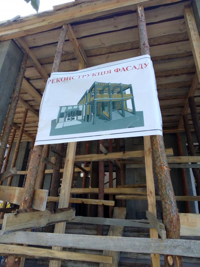 Частина цієї будівлі, в якій працює РАЦС, належить управлінню юстиції, інша частина належить підприємцю Іванові Харчуку. Саме він і проводить реконструкцію. Після її завершення на другому поверсі просто над входом буде літня тераса. Принаймні, так виглядає проект реконструкції на банері, вивішеному на дерев’яних підпорах.