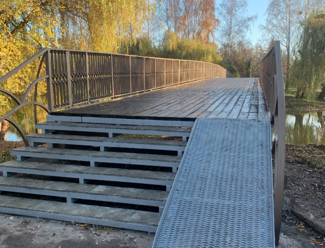 Відтак пішохідний міст отримав нове покриття, там повністю замінили дерев’яні дошки, пофарбували металеві конструкції, обладнали новий пандус і змонтували поручні.