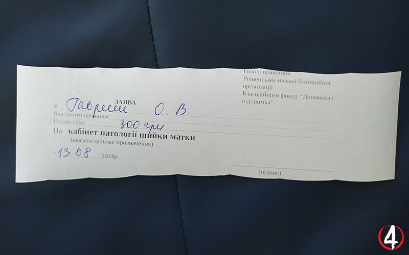 Йдеться про кольпоскопію, за видачу результату якої у пацієнтки просили заплатили 300 грн. Цю процедуру НСЗУ оплачує пологовому за Програмою медичних гарантій. Проте, за словами жінки, акушерка за вказівкою гінеколога видала їй вже заповнену вже «заяву» на 300 гривень для благодійного фонду «Допомога і підтримка».