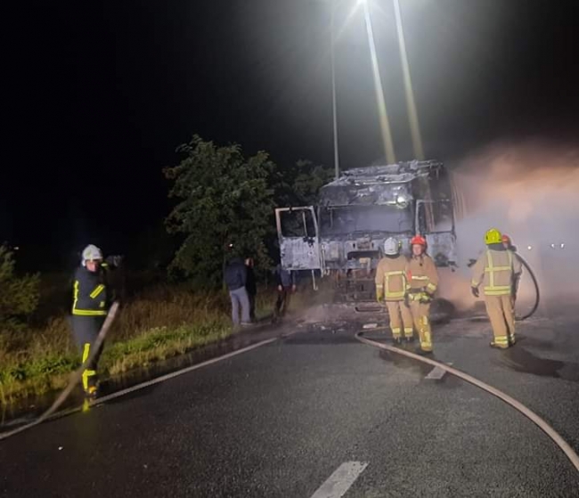 Вогнем знищено кабіну водія, моторний відсік автомобіля та пошкоджено тент причіпа.