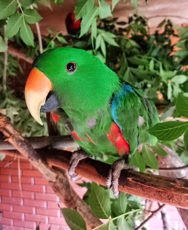 Шляхетні папуги поповнять колекцію Рівненського зоологічного парку. Нині вони звикають до своїх сусідок по вольєру – яскраво-червоних самичок.