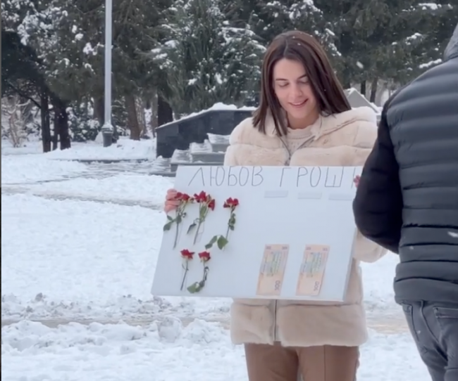 Жінка запропонувала перехожим обрати: кохання або гроші. Ті, кому ближчий перший варіант мав взяти квітку, а кому другий – купюру у розмірі 500 гривень.