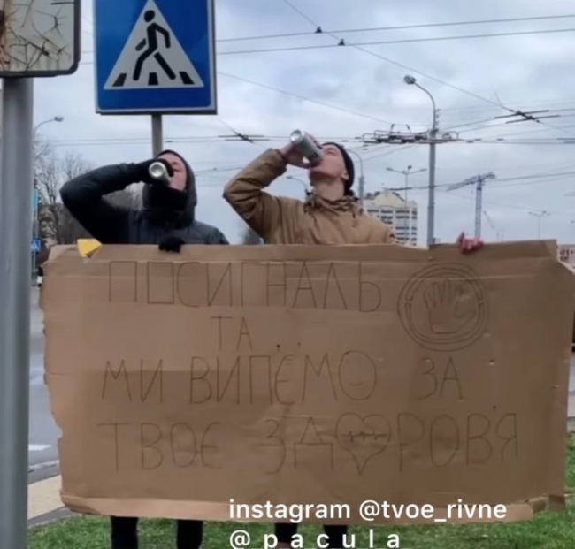 Обабіч дороги неподалік рівненського автовокзалу стояли двоє чоловіків з плакатом "Посигналь та ми вип'єм за твоє здоров'я".