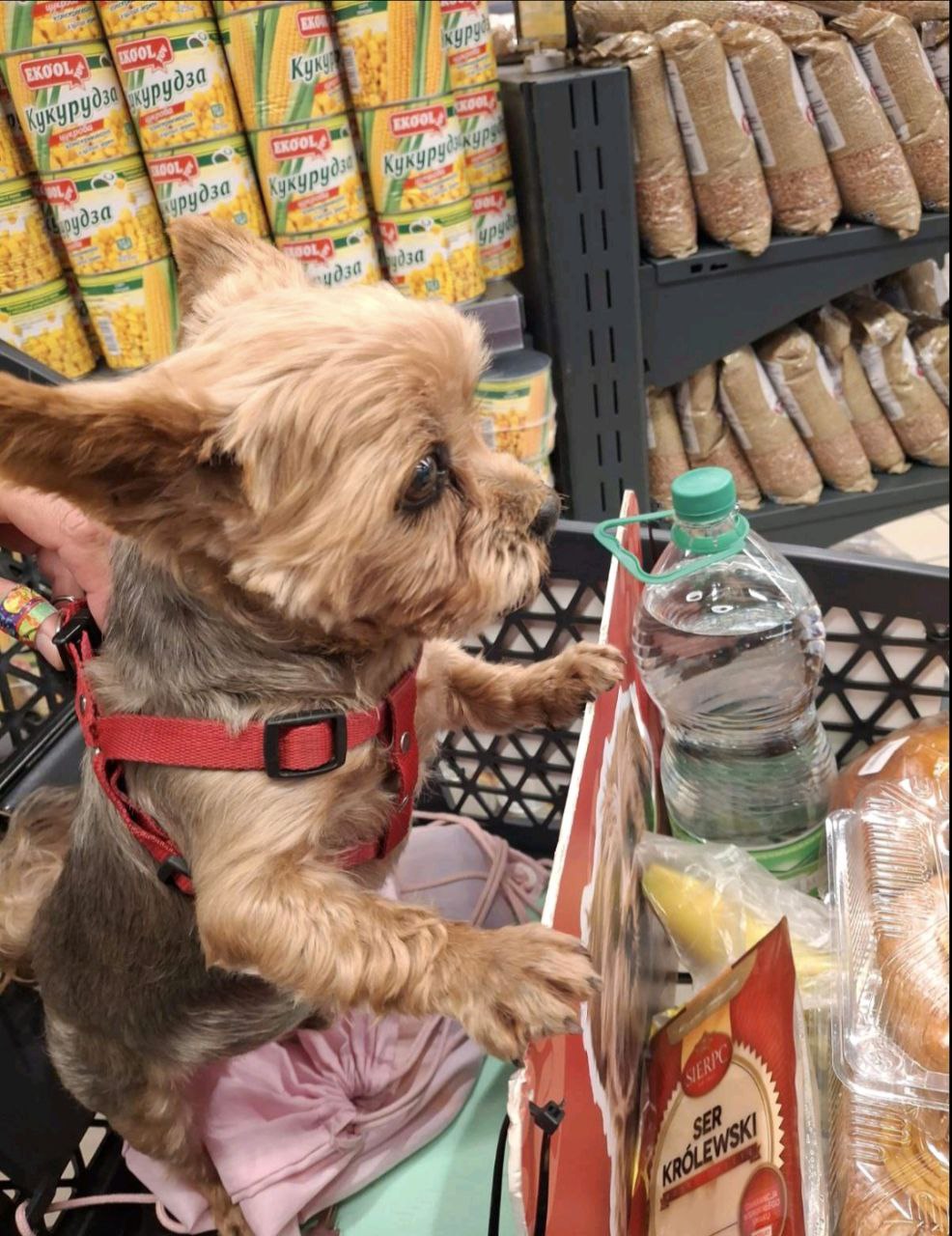 Песик Фіма був шокований такою несподіванкою та можливістю проїхатись магазином. Подорож торгзакладом була для нього цілковитою несподіванкою, з цікавістю оглядав магазин та нікого там не облаяв.