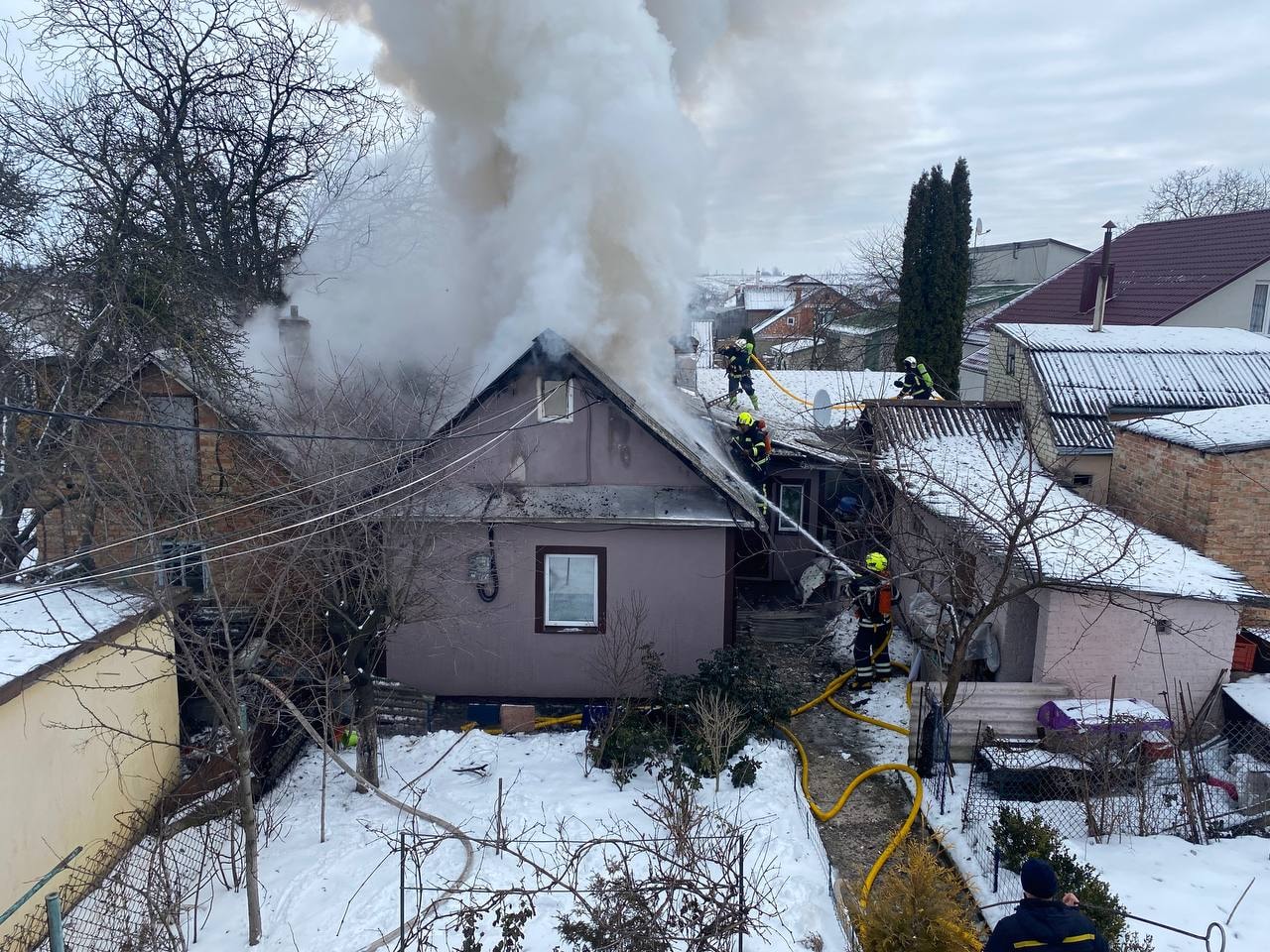 Як повідомляє ГУ ДСНС, вогонь виник на даху будинку. Є загроза перекидання вогню на поряд розташовані дві сусідні будівлі.