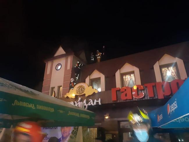 Станом на нині загорання в кафе Майдан ліквідовано! Осередок займання знаходився між покрівлею та дахом.