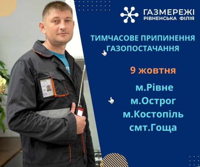Аварійно-відновлювальні роботи на газопроводі проведуть фахівці Дубенського УЕГГ Рівненської філії «Газмережі» . У зв’язку з цим з 08:00 год. 9 жовтня до 17.00 год. 10 жовтня буде тимчасово припинено газопостачання (розподіл природного газу) до осель споживачів природного газу у селах Терешів та Привітне Млинівської ОТГ.