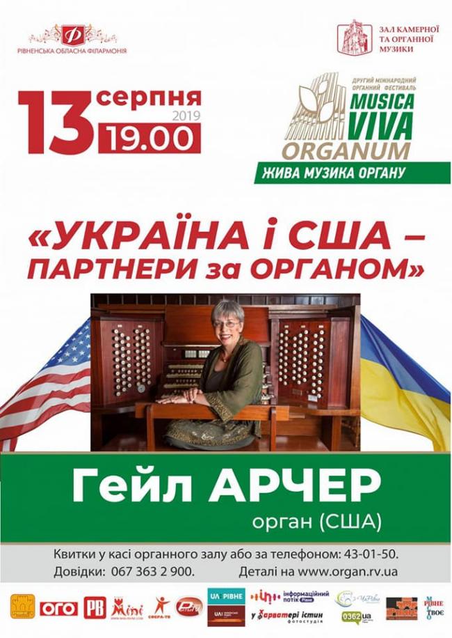 13 серпня о 19.00 сольний концерт на закриття фестивалю дасть головна органістка США Гейл Арчер.