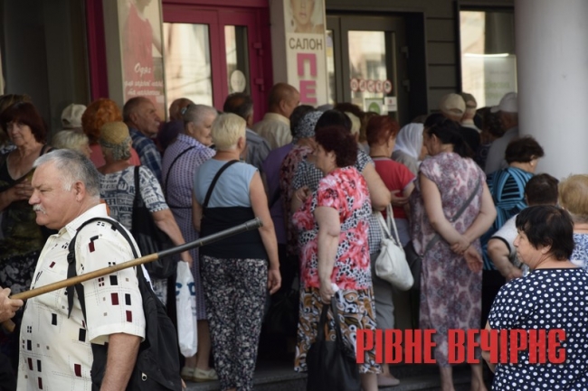 Зокрема, в ці хвилини під банківським відділенням на Соборній очікують своєї черги кілька десятків пенсіонерів. Чимало з них прийшли сюди ще о 5-7-й ранку. Дехто намагався потрапити до банку ще минулої п’ятниці, але не зміг.