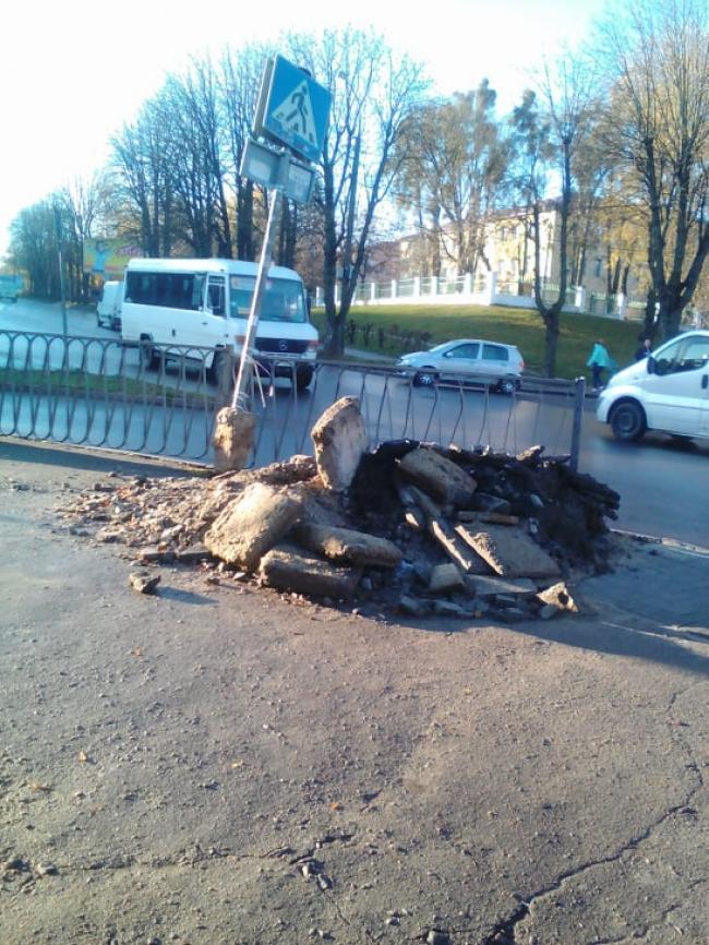 – Обабіч переходів лежить шість великих куп будівельних відподів. І «вишенька на торті» – прив’язаний до огорожі стовп з дорожним знаком.