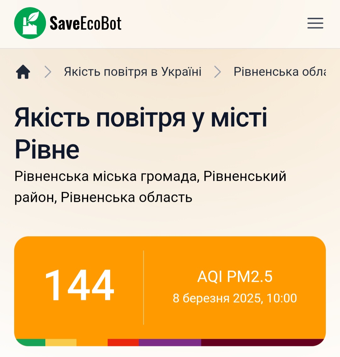 – Індекс якості атмосферного повітря, розрахований за формулою NowCast (US EPA) для головного забрудника повітря – дрібнодисперсного пилу фракції 2,5 мікрона, в місті Рівне станом на 10:00, 8 березня 2025 року дорівнює 144 – це шкідливий рівень для чутливих груп забруднення атмосферного повітря, який може спричинити дискомфорт при диханні у людей із захворюваннями легенів, таких як астма, а також у людей з серцевими захворюваннями, дітей і літніх людей.