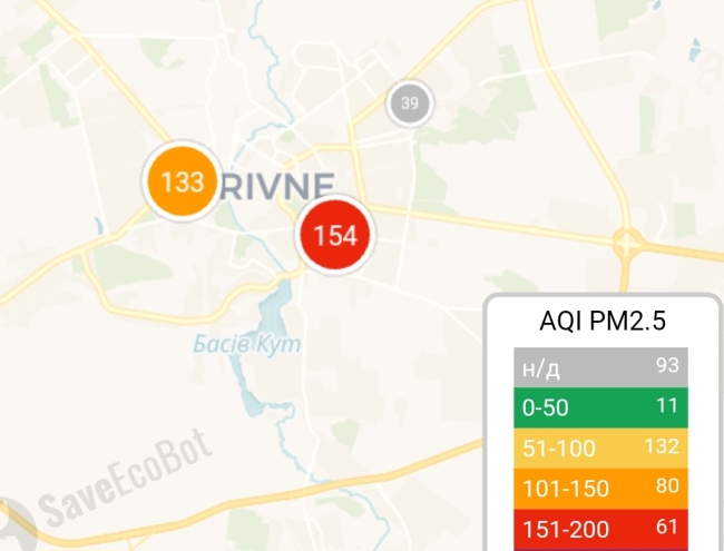 – Індекс якості атмосферного повітря, розрахований за формулою NowCast (US EPA) для головного забрудника повітря – дрібнодисперсного пилу фракції 2,5 мікрона, в місті Рівне станом на 10:00, 8 березня 2025 року дорівнює 144 – це шкідливий рівень для чутливих груп забруднення атмосферного повітря, який може спричинити дискомфорт при диханні у людей із захворюваннями легенів, таких як астма, а також у людей з серцевими захворюваннями, дітей і літніх людей.