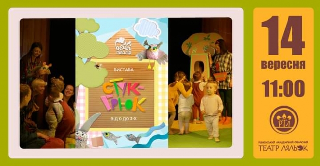 “СТУК-ГРЮК” – ексклюзивна вистава для дітей віком до 3 років, спрямована на ознайомлення малят з новими предметами, поняттями, звуками, навколишнім світом. У ній застосовуються комбінації різних фактур, кольорів, рухів, що заохочує малюків до пізнання і взаємодії. Вистава створена з урахуванням рекомендацій психологів раннього віку та досвіду закордонних “Бейбі-театрів”.